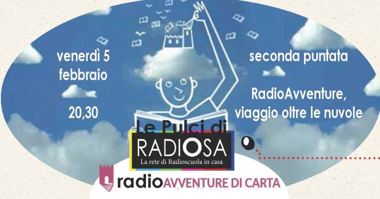 Nel secondo capitolo di RadioAvventure di carta con Le Pulci di RadiOsa sarà l’intreccio di voci e di suoni dei protagonisti dei laboratori e della formazione a creare percorsi per andare “oltre le nuvole”. Intervengono: Gloria Carraro (archeologa e consulente culturale), Raffaella Castagna (illustratrice), Matteo Frasca (musicista e pedagogista musicale), Lodovica Cima (scrittrice ed editrice), Susi Soncin (Biblioteca di Galliate e direttrice aristica del festival). Alla narrazione in rima hanno contribuito con voci e suoni Roberta, Aurora e Letizia.